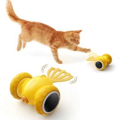 金魚をモチーフにした自動の猫用おもちゃです。光る尾びれで興味を引き付け、両側に付いた車輪で縦横無尽に動き回ります。リニューアルにより毛足の短い絨毯なら問題なく乗り越えられるようになり、髪の毛が絡みにくい車輪に改良されました。