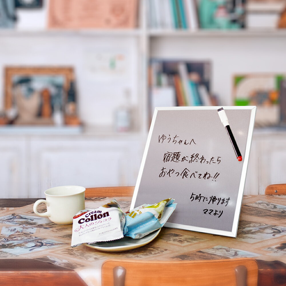 ちょっとした伝言用・メモ用には、卓上タイプのホワイトボードがおすすめ。書き残しをメモに書いて机に置いておくと存在感が薄く、他の資料に紛れて見失ってしまうことも少なくありません。卓上タイプのホワイトボードは存在感があります。何か書いてあれば誰でもまず確認をしてしまうので、メモや伝言などの書き残しを見逃すことなくしっかり把握することができます。
