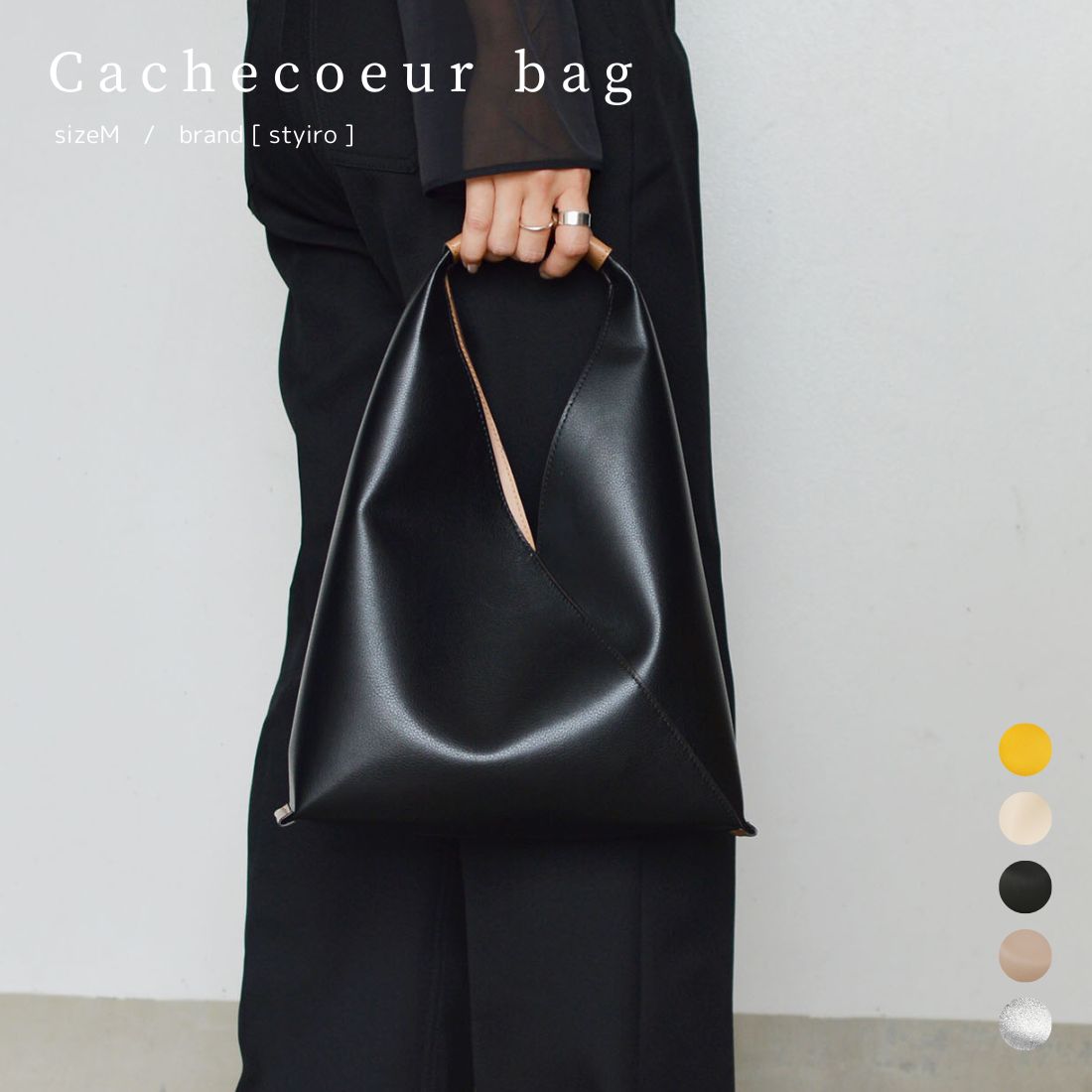 流行りのトライアングルトートは、持つだけでおしゃれに見えるのが魅力