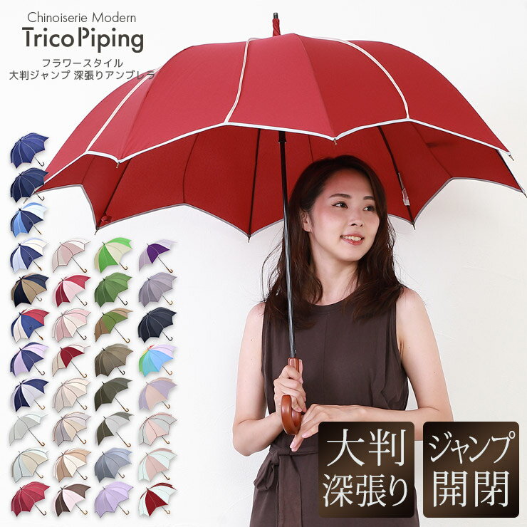 まるで花のような形状にパイピング加工を組み合わせ、ポップなデザインに仕上げています。一部のカラーには2色の布を組み合わせており、大胆な色の切り替えも魅力。大人かわいいデザインを選びたい人に注目の雨傘です。
