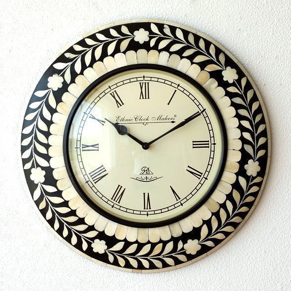 ローマ数字とフラワー模様がアンティーク調なギギlivingの「ボーンフラワーウォールクロック」です。縁の模様には、ボーン素材を使用。貝殻のような光沢感のある素材で、背景の黒色のコントラストにより、上品さを演出します。